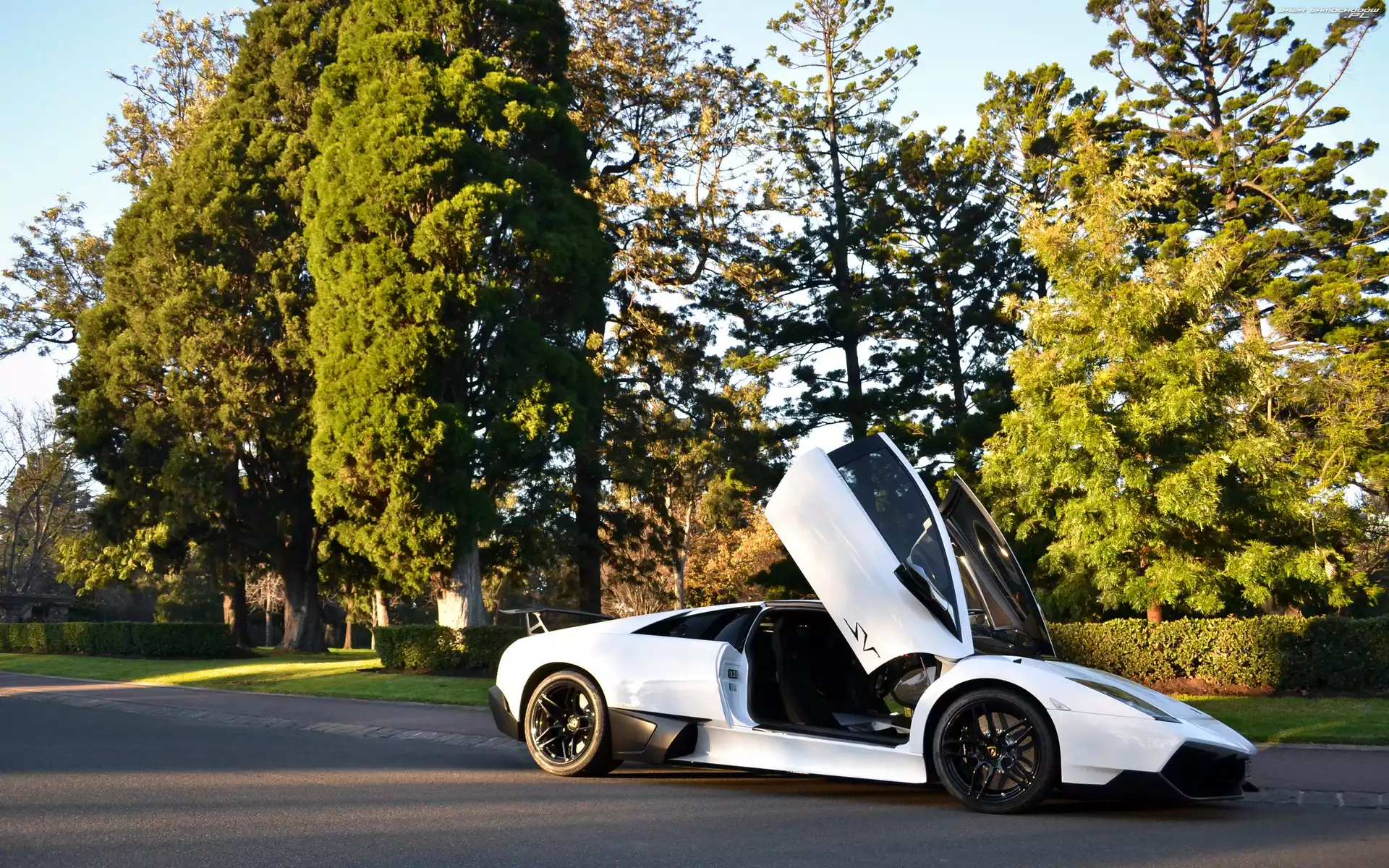 Murcielago, Białe, Park, Ulica, Lamborgini, LP670-4SV- Zdjęcia samochodów