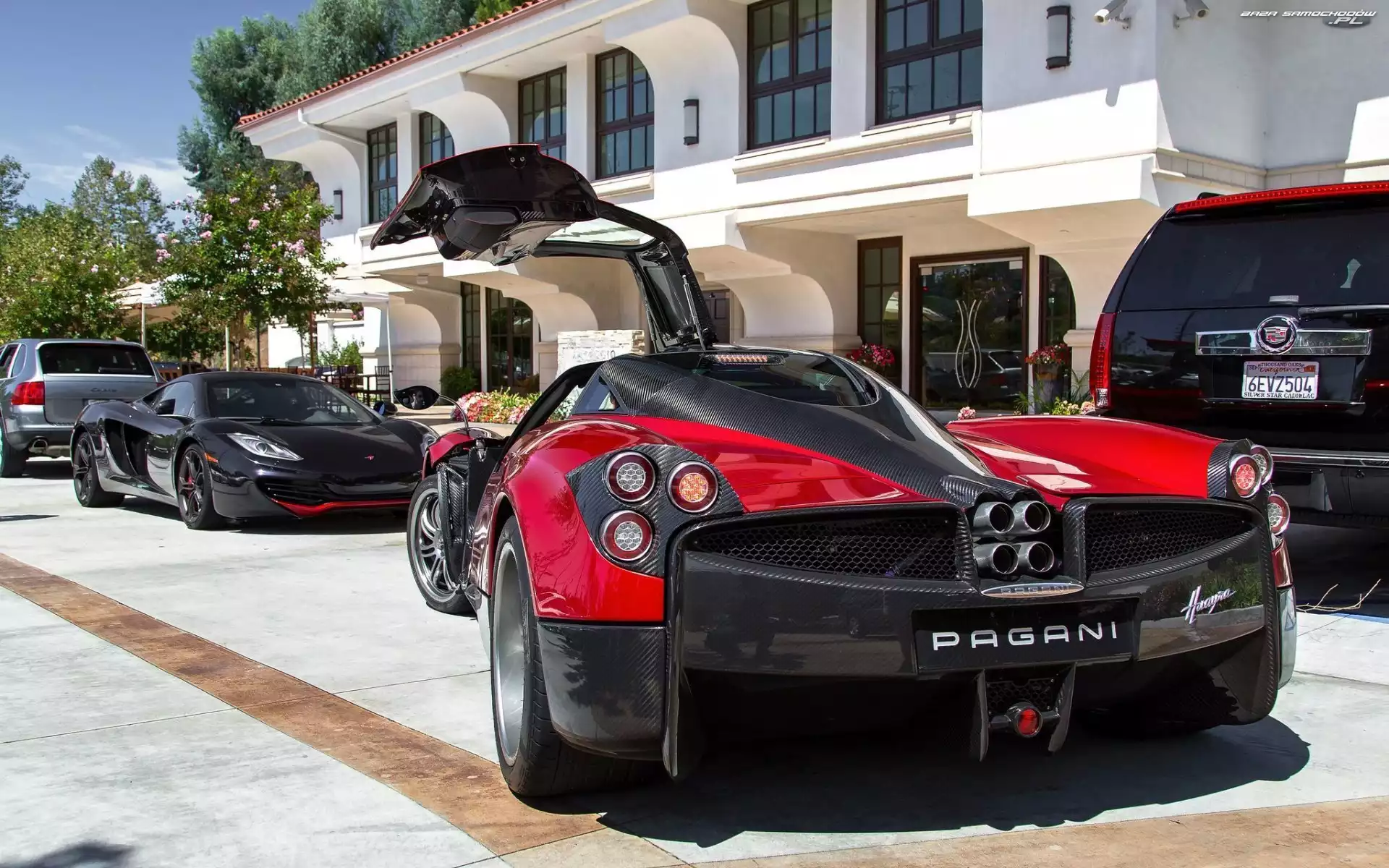 Brama, Czerwony, Pagani Huayra Pagani Zonda F Na Torze, Pagani Zonda Bok, Pagani Huayra Lampo, Biało-czerwone Samochód, Huayra, Czerwony, Pagani Pagani Huayra, Drzewa, Niebieski, Droga Pagani Zonda R